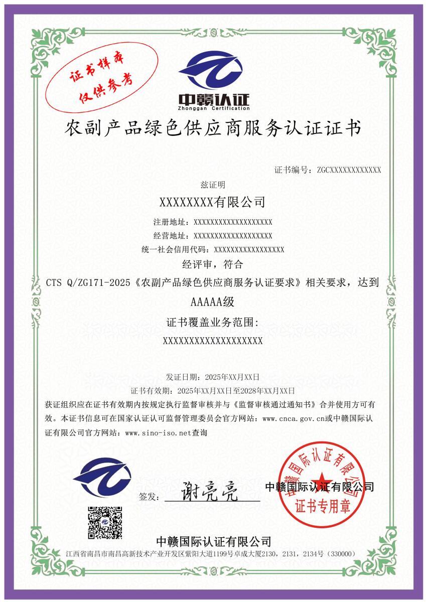 农副产品绿色供应商服务认证证书